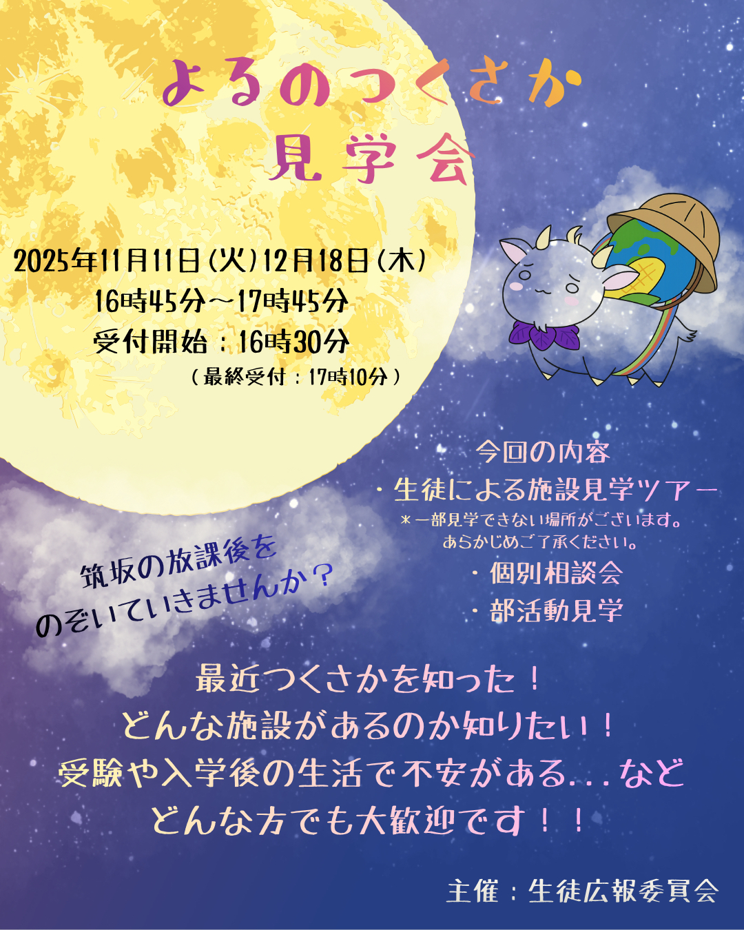- 【中学生向けイベント】11/11(火)夜の筑坂見学会(よるつく)開催のお知らせ