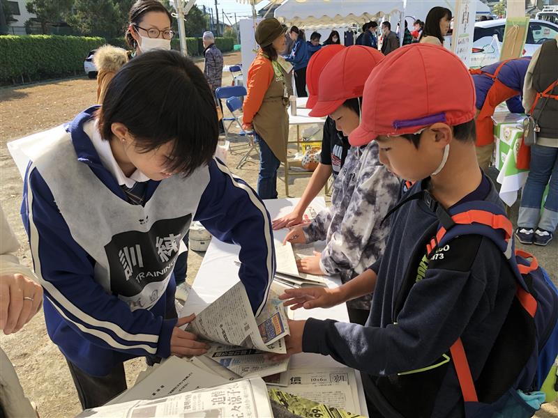 本校生徒のボランティア参加は3年目になり、今年も災害時に新聞紙・チラシで作成できる紙皿体験のブースのお手伝いに携わらせていただきました。