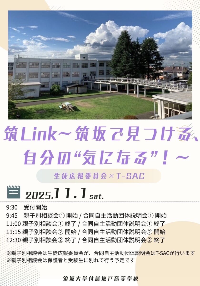 この度11月1日(土)に生徒広報委員会主催「中学生向け自主活動紹介説明会(TSAC合同開催)」と「親子別説明会」を開催します!